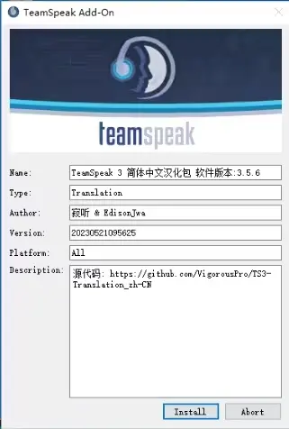 安装,之后重启TS3程序即可汉化