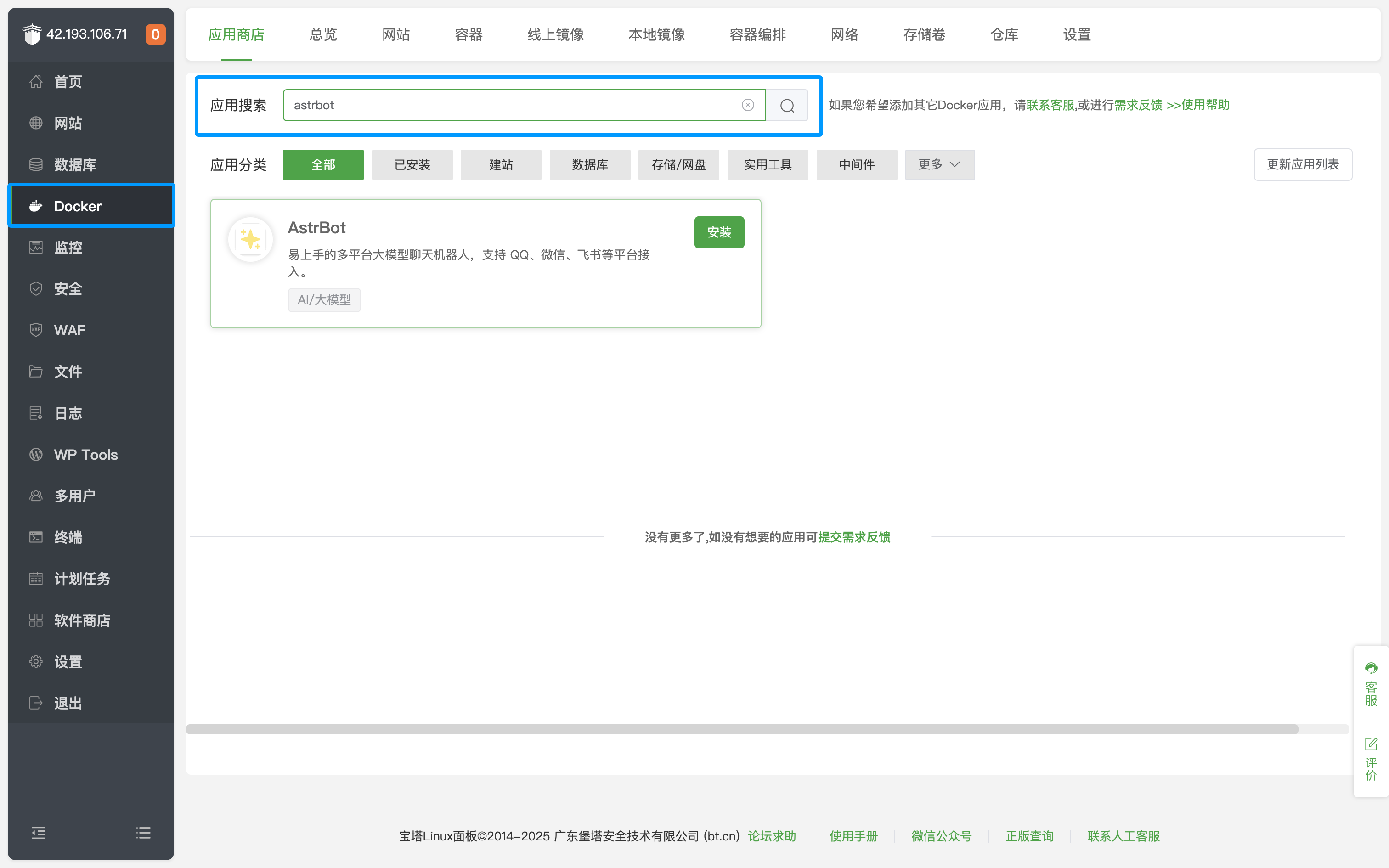 2.在“应用商店”中搜索 AstrBot,点击安装即可。