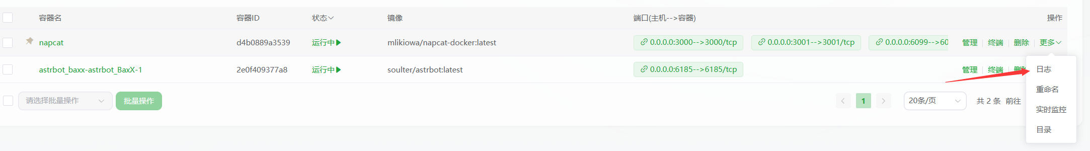 在容器列表中找到 napcat 容器,点击右侧“更多”→“日志”。