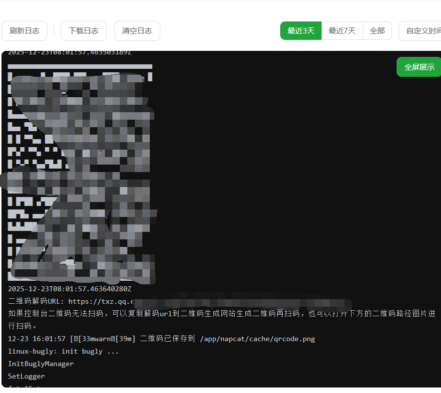 NapCat 启动后,我们需要查看容器日志以获取登录二维码和管理面板地址。