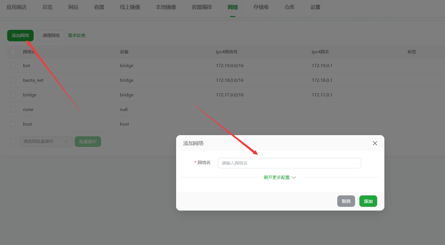 在宝塔 Docker 页面,进入“网络”选项卡,点击“添加网络”。