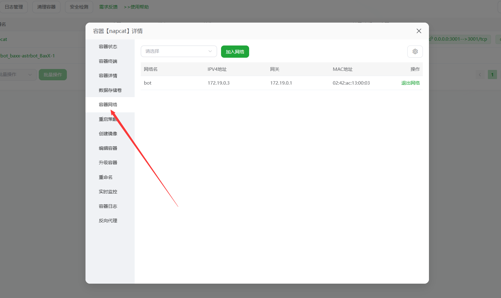 选择刚创建的 bot-network,点击“加入网络”,并移出其他网络,确保该容器只属于这个新建的网络。