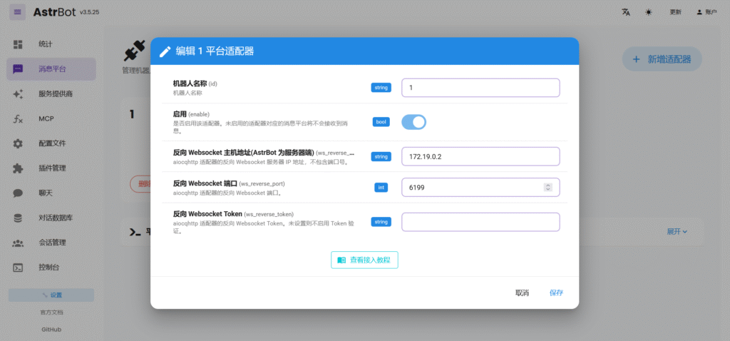 - 地址:填写上一步获取的 AstrBot 容器 IP